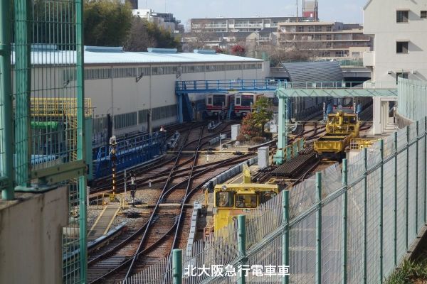 新御堂筋を陸橋で渡って北大阪急行電車の車庫横を通る。 |