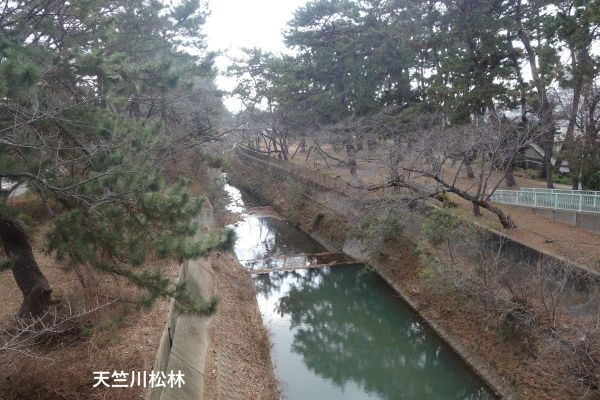 | 山ケ池南の車道を右折し天竺川に出て左折し、天竺川の松林を南に進む。 |