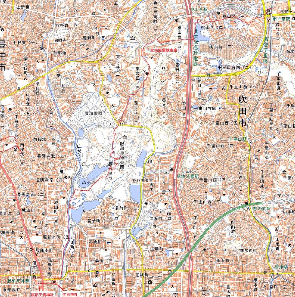 | 北大阪急行の南千里駅から服部緑地を散策して天竺川の美しい松林を歩いて住吉神社、服部天満宮にお参りして阪急服部天神駅までのコース。 |