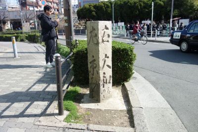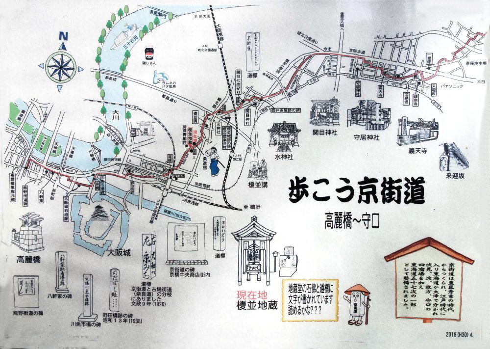 秀吉の定めた京街道は京橋口から始まる(後に高麗橋が起点になった)。JR大阪城北詰駅を出てすぐ左折すると野田町の町名引継ぎ記念碑がある。京阪電車の下を通って右折し線路沿いに京橋駅北の交差点には京街道の道標がある。 |