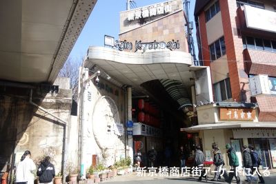 交差点を渡って新京橋商店街のアーケードに入る。 |