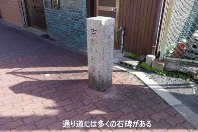 通りには多くの道標(京橋口からの距離表示有り)があり分かり易い。榎並地蔵を過ぎ野江の交差点を渡りすぐの道標から右折する。すぐ左折しまもなく大道りに出で左折、野江国道筋商店街を進むJRの高架下を過ぎて次の分岐で左の七曲りの小道に入る。 |