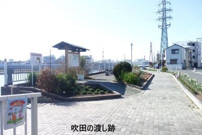 阪急相川駅を降りて神崎川を渡ったところを左折して川沿い道歩くとすぐに右に林が見え住宅の間を入ると高浜神社の御旅所がある。川沿いに戻って5分程で吹田の渡し跡がある。明治の初期まで大きな渡船場があったようだ。 |
