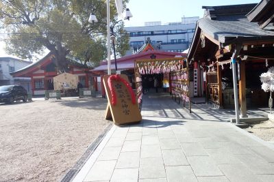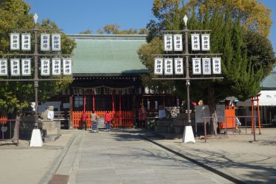 西門を出て車道を渡り服部天満宮の境内に入る。足の神様で健脚で歩けるようお参りする。北門を出て大通りを左折するとすぐ阪急服部天神駅に着く。 |