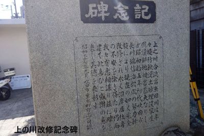 図書館や保健所を通って車道に出て右折。15分程で阪急豊津駅を超え川を渡った交番の前に上の川改修記念碑が建てられている。 |