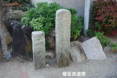 車道の北側の住宅街の小道を西に進み、北大阪急行や名神高速の下を潜ると古道となり30分程のところに榎坂西道標がある。直進は服部・尼崎、右は勝尾寺と表示されている。 |