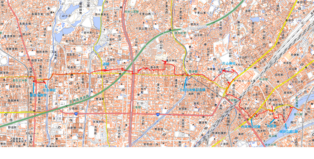 | 阪急相川駅から吹田の渡し跡、片山神社、垂水神社、天竺川、住吉神社、服部天満宮を廻って阪急服部天神駅までの旧吹田街道を歩くコース。 |