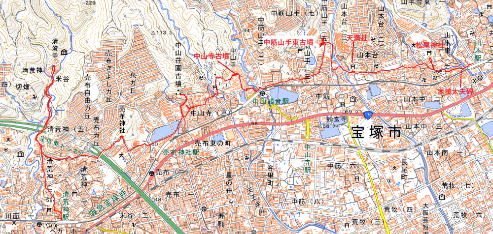 | 阪急山本駅から松尾神社・天満社・中筋山手東古墳・中山寺(中山寺古墳)・市杵島神社・中山荘園古墳・売布神社・清荒神と神社と古墳を回るコース |